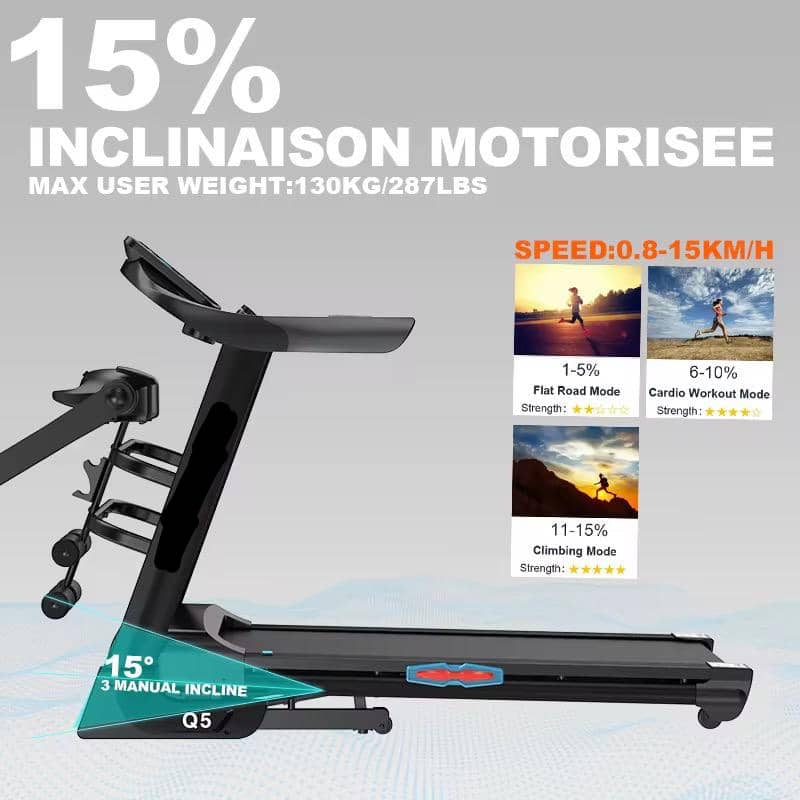 Tapis roulant Tata sport, poids d’utilisateur max 130kg, écran Led, inclinaison automatique, vitesse jusqu’à 15km/heure, avec appareil de massage.